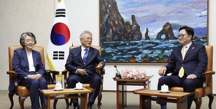 4月25日,在韩国国会,国会议长禹元植(右)会见到访的前总统文在寅(中)和其夫人金正淑。图源:韩媒