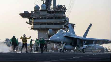 当地时间4月1日,一架F/A- 18E“超级大黄蜂”战斗机正在“哈里·杜鲁门”号航空母舰上准备发射。图源:美媒报道配图