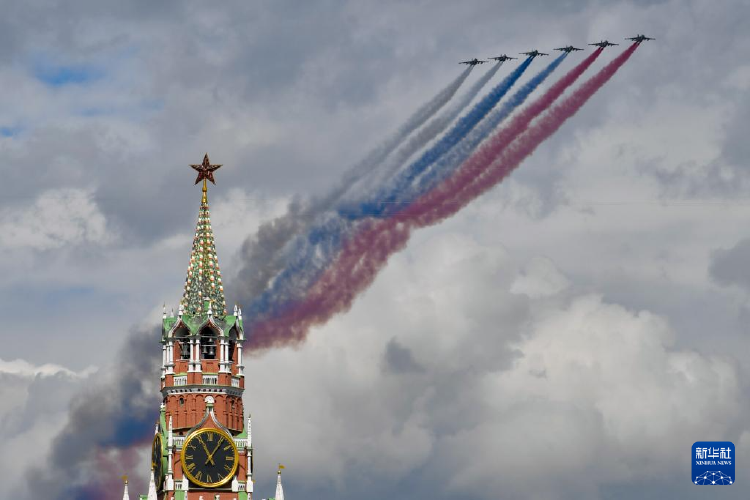 当地时间5月7日,在俄罗斯首都莫斯科,战机编队参加纪念苏联伟大卫国战争胜利80周年阅兵式彩排。新华社 图