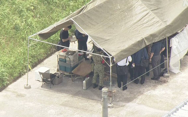 日本电视台航拍画面显示,几名自卫队人员聚集在围栏附近的一顶帐篷周围,一辆标有“未爆炸炸弹处理”字样的车辆停在那里,帐篷下还可以看到一些疑似黑色炮弹的东西。