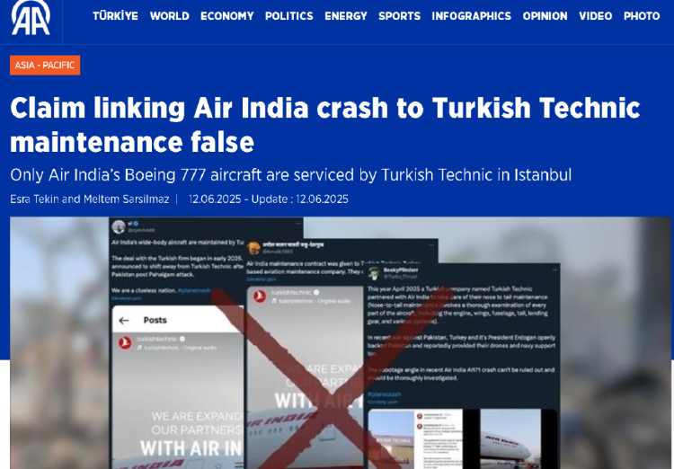 最后,有土耳其的媒体还发现,他们的国家也被莫名其妙地卷入了这场由印度空难而引发的舆论旋涡中,因为有一些印度的账号发帖宣称,印度航空的787客机是由一家土耳其的公司在土耳其进行维护的。