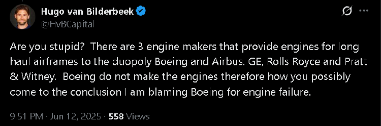 这种推锅甚至还影响到了美国的通用电气公司。毕竟,失事的波音787客机的引擎,是通用电气公司生产的。有人就因此认为,事故的责任在通用电气,不能怪波音。还有人宣称美国通用的引擎不如同样为波音提供引擎的英国罗尔斯·罗伊斯公司。一名英国网友更表示,搭载着英国罗尔斯·罗伊斯引擎的法国空客客机才是安全的。