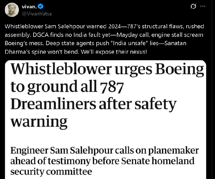 目前,在境外的社交网络上,支持波音公司的声音和支持印度航空公司的声音就已经开始了互相指责。前者认为,是印度的航空公司乃至印度的民航业的问题,导致了事故的发生,与波音公司无关;后者则认为前者是在对印度进行种族歧视,并翻出了波音公司从先前因软件问题导致 737MAX 客机接连坠毁、害死数百人,到多名吹哨人曝光该公司忽视甚至掩盖客机质量问题与安全隐患的黑历史——甚至有一名认为787客机本身有安全隐患的吹哨人,还离奇“自杀”了。