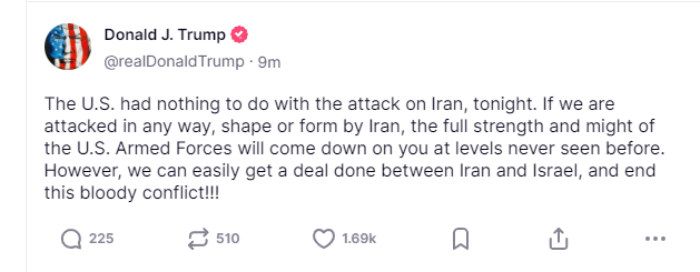 美东时间15日凌晨,美国总统特朗普在社交平台上称,“美国与伊朗今晚遭袭一事无关”,并警告说,若伊朗以任何形式对美方发动攻击,美国武装力量将“以空前规模全力回击”。