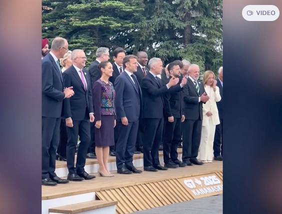 马克龙发布的视频显示,伴随《Capybara》的配乐,参加G7峰会的多国领导人依次登台合影,包括他自己、意大利总理梅洛尼、乌克兰总统泽连斯基、加拿大总理卡尼、英国首相斯塔默、欧盟委员会主席冯德莱恩等等。