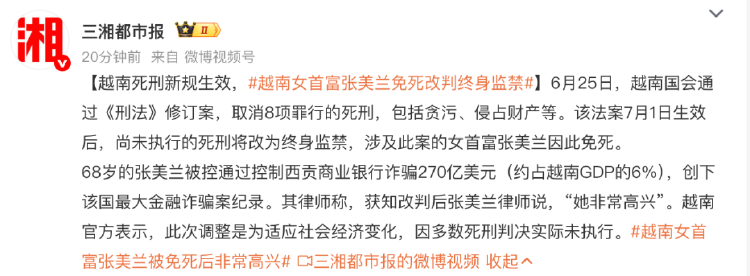 扬子晚报消息,6月25日,越南国会通过刑法修订案,取消8项罪行的死刑,包括贪污、侵占财产等。该法案7月1日生效后,尚未执行的死刑将改为终身监禁,涉及此案的女首富张美兰因此免死。