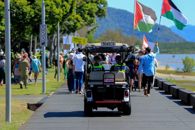 当地时间2025年8月24日,澳大利亚凯恩斯,昆士兰州警察跟随着支持巴勒斯坦的游行队伍。视觉中国 图