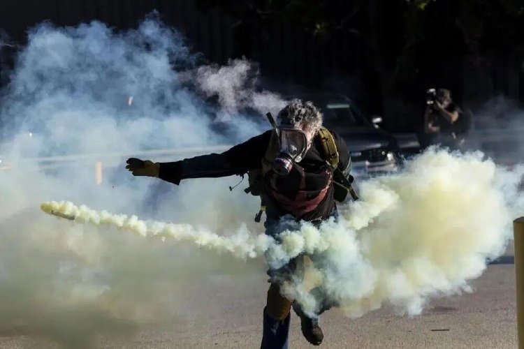9月26日,在位于美国芝加哥西郊布罗德维尤市的移民与海关执法局办事机构外,抗议者在冲突中将执法人员发射的催泪弹瓶扔回 图:新华社
