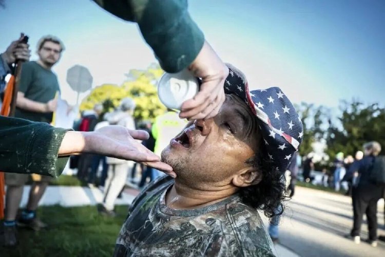 9月26日,在位于美国芝加哥西郊布罗德维尤市的移民与海关执法局办事机构外,执法人员发射的催泪弹伤及一名抗议者,同伴在为他进行紧急处置 图:新华社