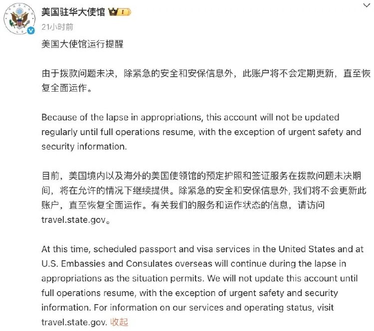 目前,美国境内以及海外的美国使领馆的预定护照和签证服务在拨款问题未决期间,将在允许的情况下继续提供。除紧急的安全和安保信息外, 我们将不会更新此账户,直至恢复全面运作。