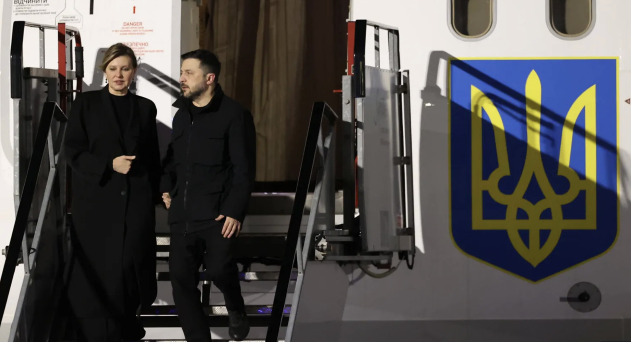 当地时间12月1日,泽连斯基(右)与妻子叶莲娜抵达都柏林。图自外媒