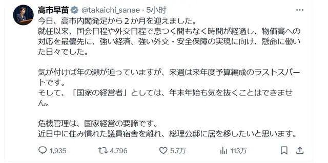 高市早苗在帖文中提到,“计划在近日内离开已经习惯的议员宿舍,搬入首相公邸” 图:环球时报援引自高市早苗社交媒体