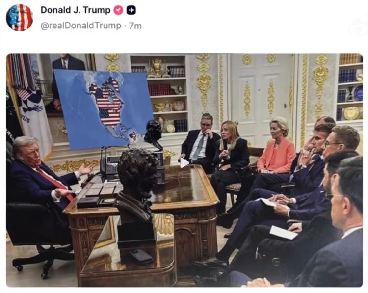 就在同一天,特朗普还发布了另一张图片:他在白宫办公室与欧洲领导人会面,后面展板上的地图中,除美国本土外,加拿大、格陵兰岛和委内瑞拉均被美国国旗覆盖。