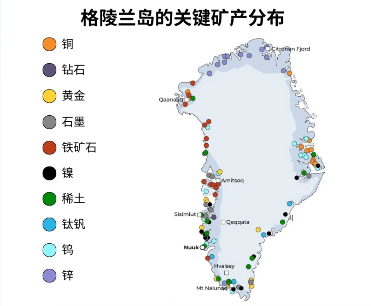 除了白宫声称格陵兰岛具有重要战略地位之外,随着气候变暖,北冰洋海冰加速融化,北极航道的商业潜力也日益凸显。不仅如此,格陵兰岛还富集稀土、石墨、铜、镍等芯片制造所需资源,对先进制造和国防技术至关重要。欧盟认定的34种关键矿产中,31种可以在格陵兰岛找到。美国地质调查局还判断格陵兰岛附近海域富含油气资源。