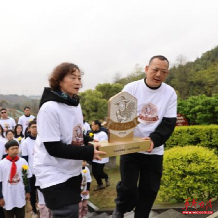 在袁隆平院士墓前,湖南省袁隆平农业科技奖励基金会秘书长辛业芸和“爷爷的水稻田”公益项目发起人曾松亭一起更换了新的“爷爷的水稻田”标识牌。