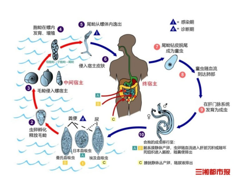 湖南省血吸虫病防治所(省第三人民医院)所长李博提醒,血吸虫病由日本血吸虫引起,是法定乙类传染病。钉螺是其唯一中间宿主,常潜伏于水沟、稻田、芦苇滩等地。宿主动物接触含尾蚴的“疫水”仅需10秒,尾蚴即可钻入皮肤,导致感染。初期症状如皮疹、发热、腹泻等易被误诊为感冒,而晚期可能引发肝硬化、腹水等“大肚子病”,危害极大。