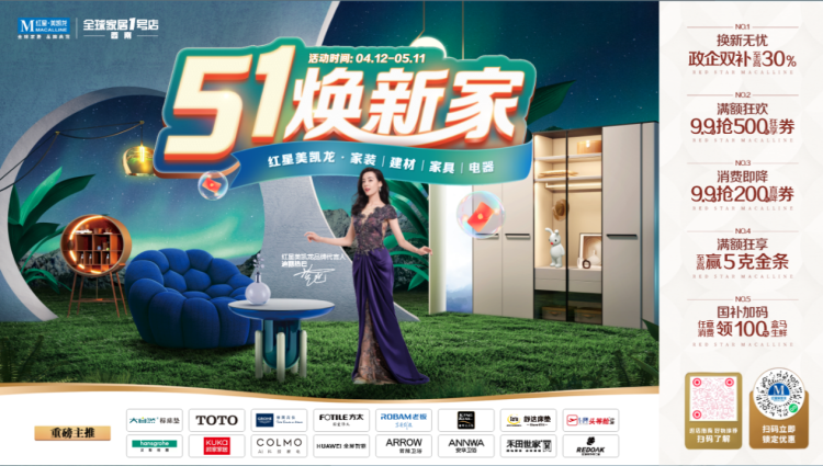 据悉,此次红星美凯龙开启“51焕新家”活动,涵盖了家装、建材、家具、电器等品类,能够让消费者一站式购齐。通过政企双补的形式至高可优惠30%。