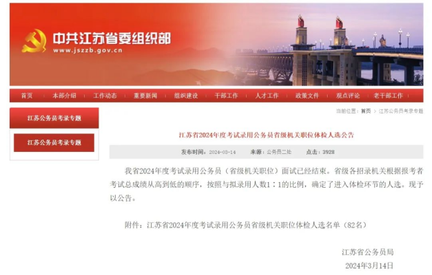 原标题:江苏省2024年度考试录用公务员省级机关职位体检人选公告