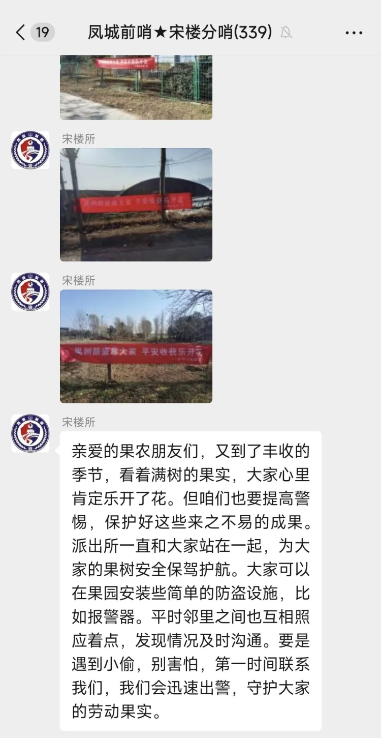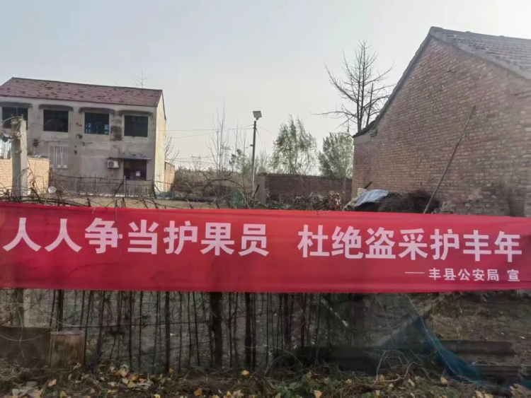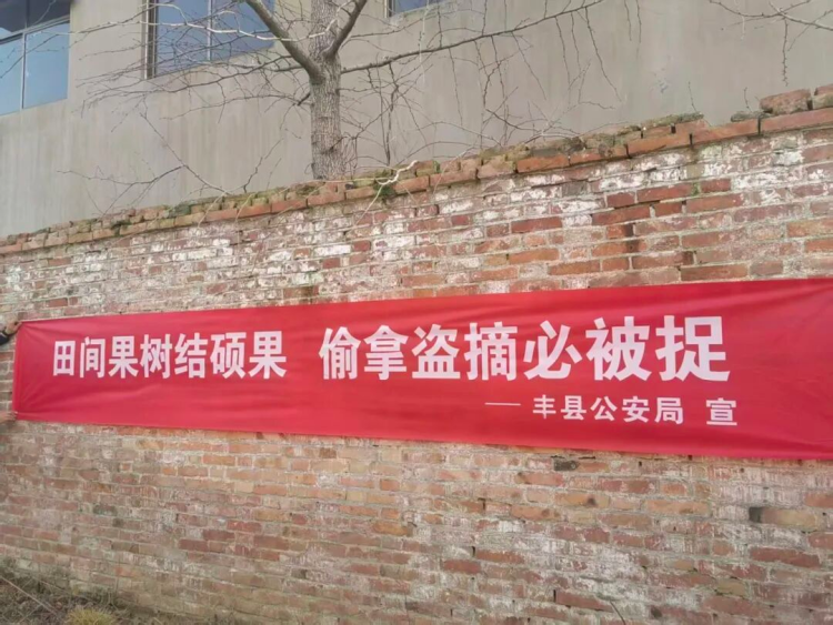 为守护果农的劳动成果,丰县警方依托“凤城前哨”机制,积极开展宣传行动。民警们深入村里,走进田间地头,通过悬挂横幅的方式,让安全警示随处可见。那一句“田间果树结硕果,偷拿盗摘必被捉”,简单直白却掷地有声,给那些妄图偷窃之人敲响了警钟。