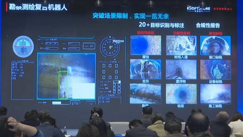 “勘察测绘机器人”作为一款水陆两栖设备,主要应用于水利工程、市政管网检测及石油化工管道勘察等多样性环境,它凭借算法可识别约28种目标病灶,还能够实现管道自主扫描与三维建模。