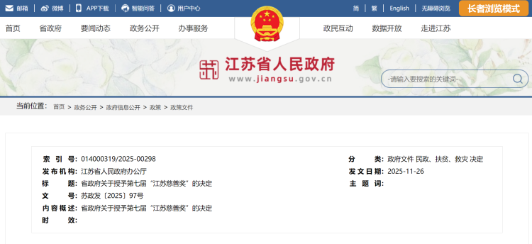 近日,江苏省人民政府官网发布《省政府关于授予第七届“江苏慈善奖”的决定》。