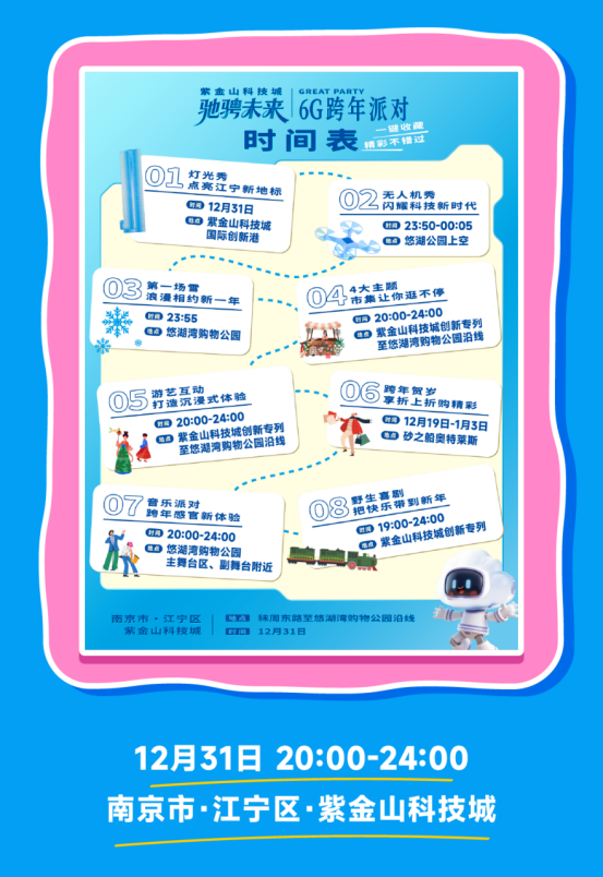 江宁区将文化体验与休闲娱乐深度融合,为市民打造多层次跨年选择。青春盛宴与科技潮玩双向奔赴。12月31日,“江宁大学生跨年音乐荟”在江宁体育中心上演,这场由学子“自编自导自演”的青春舞台,在倒计时中书写青年对2026年的期许。秦淮商圈“6G跨年派对”则解锁未来感迎新方式,12月31日当晚,紫金山科技城将上演灯光秀、人机互动等沉浸式体验,悠湖湾购物公园上空将降下“浪漫初雪”,砂之船奥特莱斯同步推出跨年贺岁折上折优惠,让“科技+购物”成为潮流青年的跨年新选。