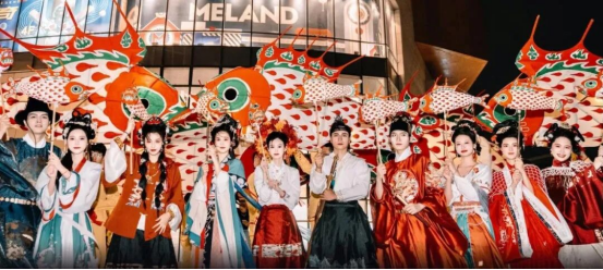 以“我在北岸过大年”为核心主题,江北新区推出近60场特色文旅活动。作为年度重头戏,第40届中国秦淮灯会首次登陆桥北商圈设立分会场,2025年12月31日至2026年3月31日期间,23组大型主题灯组沿江山路、大桥北路延展,将秦淮河畔的千年灯彩魅力延续至长江北岸。跨年夜当晚,国风巡游、潮流演艺与跨年盛典同步集结,《寻光·鱼灯纪》巡游队伍中,3盏3米长巨型鱼灯领衔,身着华美汉服的持灯人穿梭商圈互动合影,重现“秦淮灯影晃琉璃,鱼龙曼舞夜不眠”的盛景。