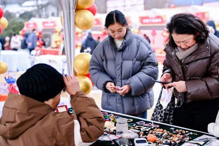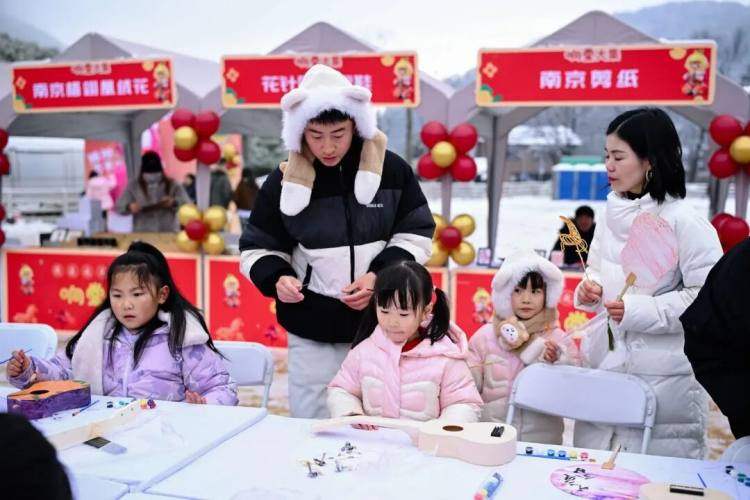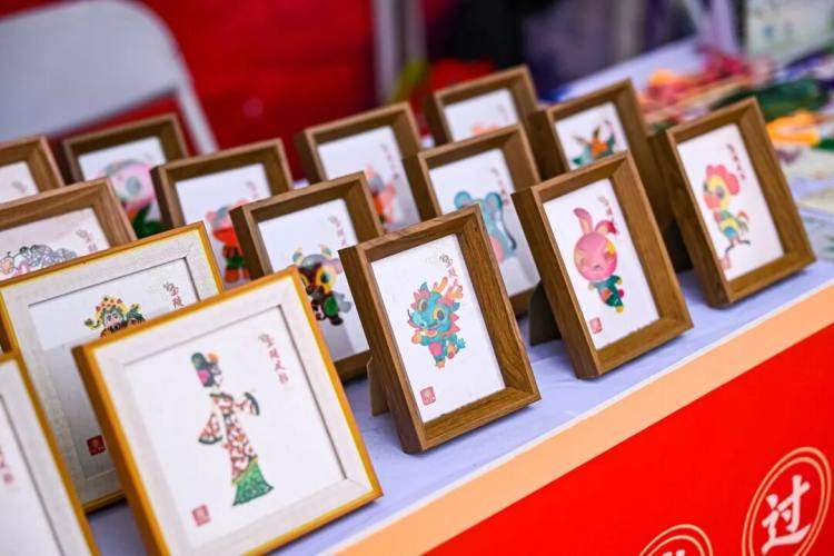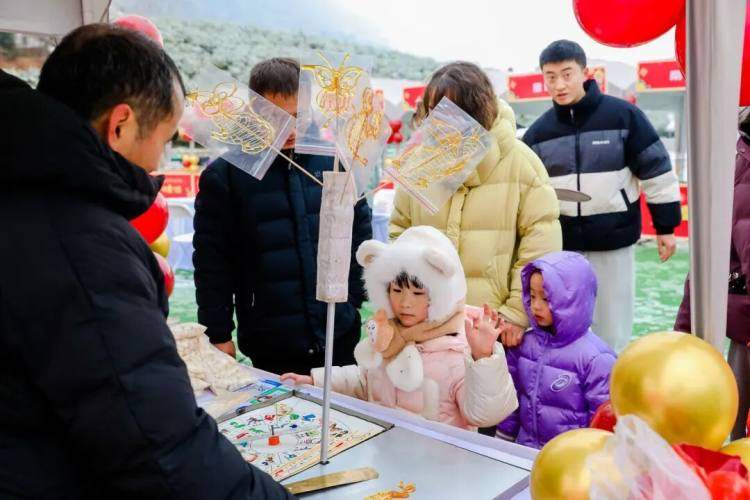 剪纸、糖画、布鞋等非遗产品整齐陈列,雪粒子偶尔飘落在作品上,为这份传统韵味添了几分灵动。