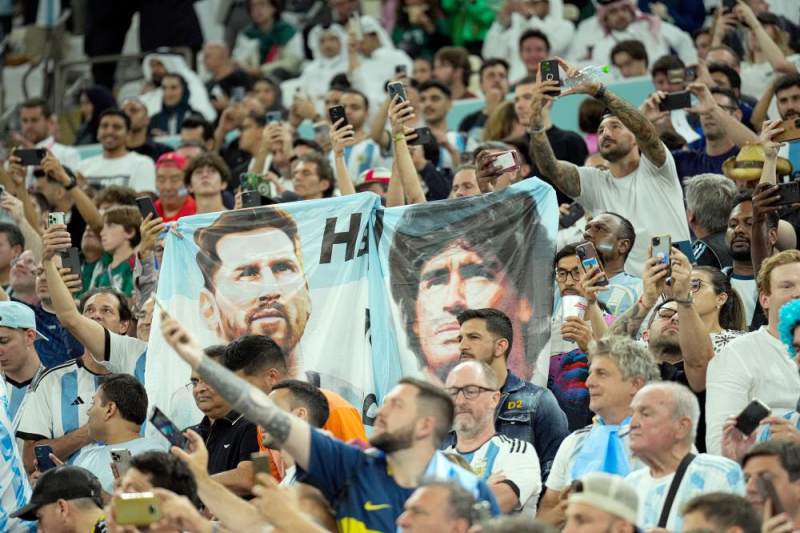 值得一提的是,今天刚好是马拉多纳去世两周年,看台上的阿根廷球迷同时举起马拉多纳和梅西的巨幅海报,让人泪目。