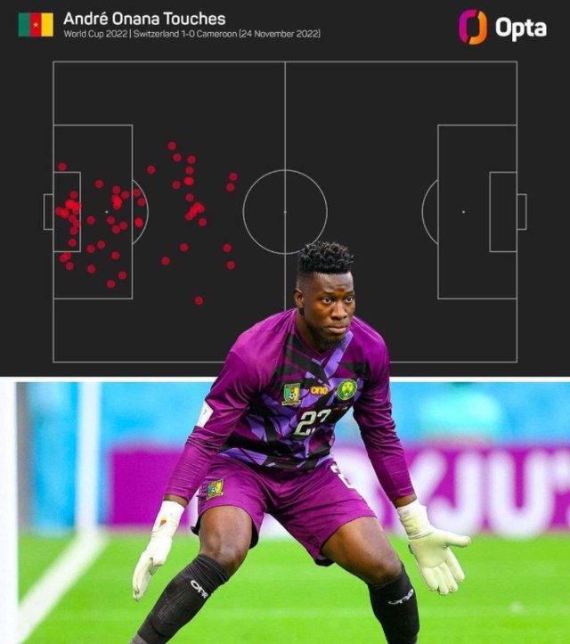 根据国际足联赛后的数据显示,喀麦隆队门将奥纳纳全场传球共60次,为队内最多。
