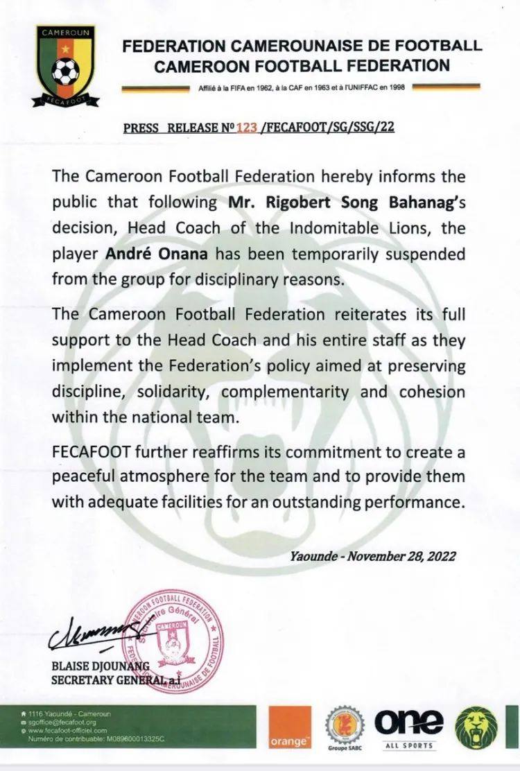 喀麦隆足协官方声明宣布奥纳纳禁赛