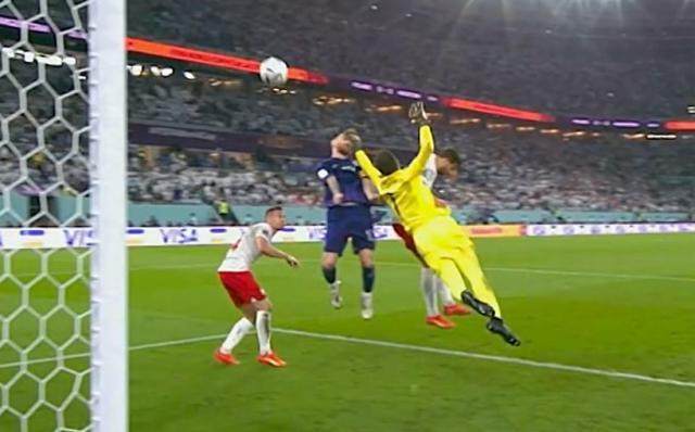 第39分钟,阿尔瓦雷斯禁区左侧射门被什琴斯尼扑出后传中,什琴斯尼后点托出后手触梅西面部,并将梅西撞倒在地,阿根廷队员提出申诉,荷兰主裁马克利到场边观看VAR回放后补吹点球,但梅西主罚的点球被什琴斯尼托出,阿根廷错失进球良机。