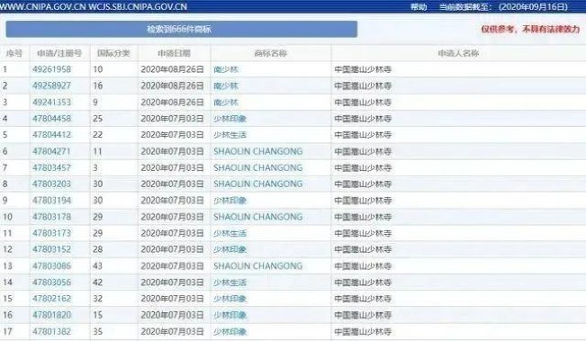 2020年9月,少林寺发布声明,否认和国货品牌“森马”有任何跨界合作,更以侵权为由,要求其下架所有标注“少林”二字的商品。这时人们也才惊奇地发现,根据国家知识产权商标局中国商标网的数据,从1997年到2020年,嵩山少林寺申请的商标已经达到666个。