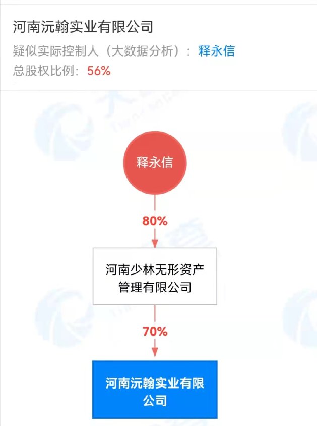 而铁嵩科技的两大股东为河南铁投综合开发有限公司和河南沅翰实业有限公司(下称“沅翰实业”),持股比例分别为51%、49%。沅翰实业由河南少林无形资产管理有限公司(下称“少林资管”)持股70%,而少林资管又被现任少林寺方丈释永信持股80%。从股权路径看,释永信是沅翰实业最终受益人。