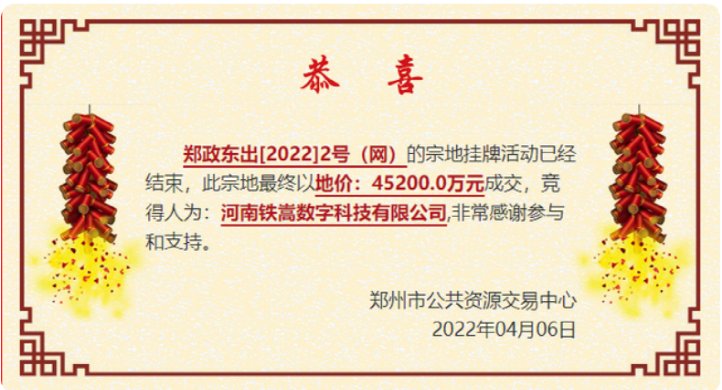而河南铁嵩数字科技有限公司以4.52亿元底价竞得郑政东出[2022]2号(网)地块使用权。该地块位于育翔路南、龙湖内环东路西,面积57.25亩,为零售商业、批发市场、餐饮、旅馆用地、商务金融用地。