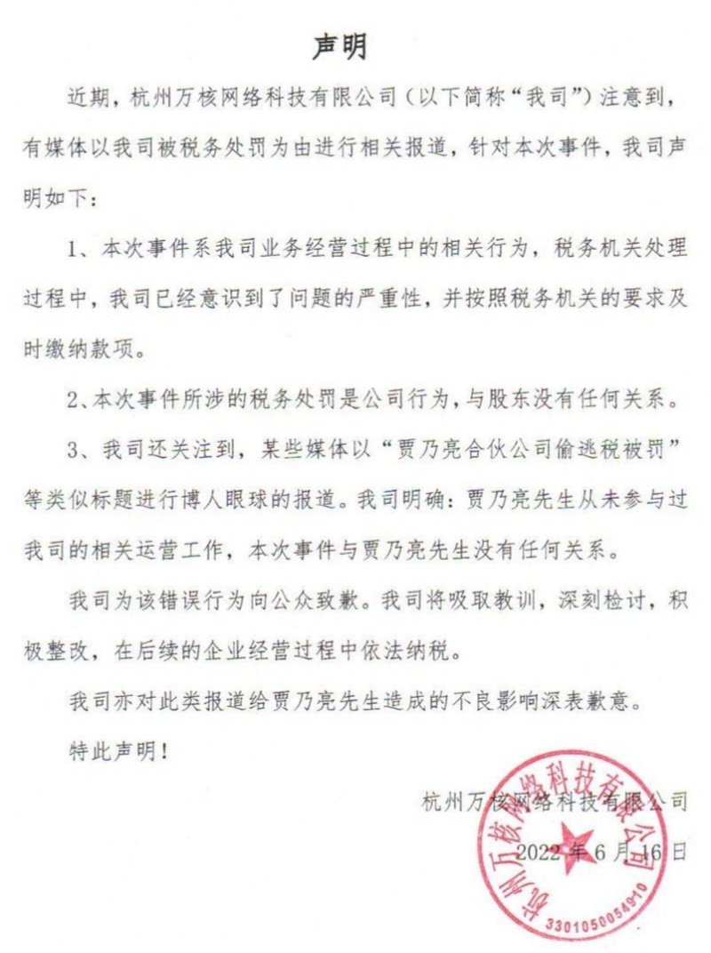 随后,涉事公司@万核网络针对于网络热门事件,发布声明:对于税务处罚我司表示深刻反省并已及时缴纳款项,我司向公众致歉,同时针对此类报道给贾乃亮先生造成的不良影响深表歉意。