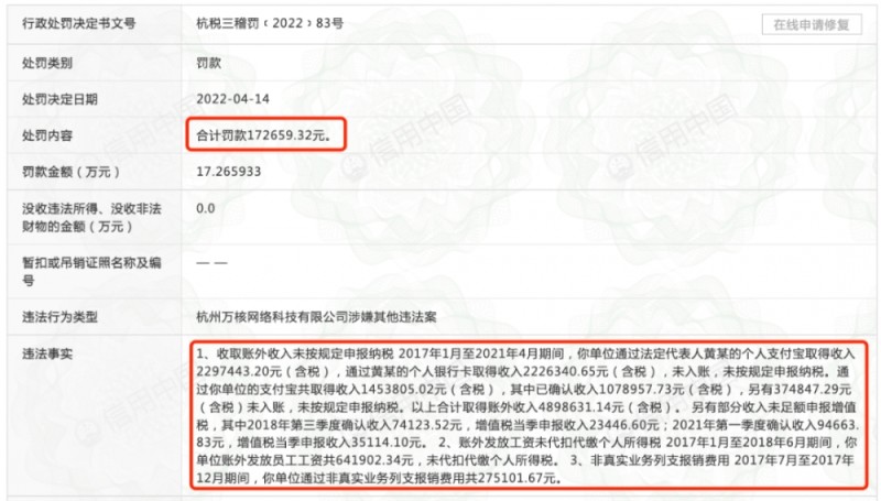 违法事实显示,杭州万核收取账外收入未按规定申报纳税,2017年1月至2021年4月,该公司通过法定代表人黄某的个人支付宝、银行卡分别取得收入2297443.20元(含税)、2226340.65元(含税),未入账,未按规定申报纳税;通过单位支付宝取得收入374847.29元(含税)未入账,未按规定申报纳税;另有部分收入未足额申报增值税。