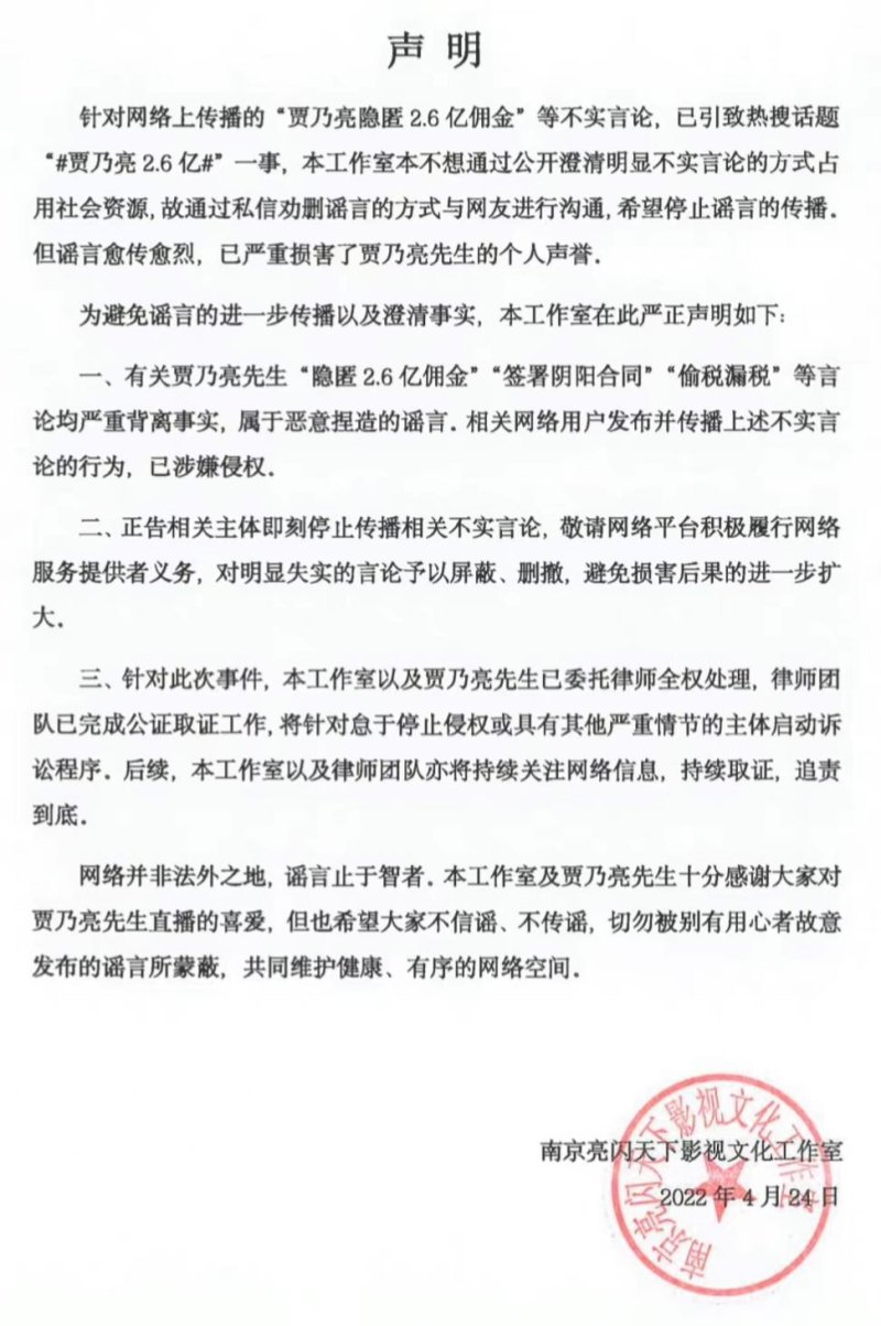 4月24日中午,贾乃亮工作室官方发布声明,对此予以驳斥:针对近日有关“贾乃亮偷税漏税2.6亿”传闻一事,贾乃亮工作室对此发表声明予以否认。声明称,工作室原本不想占用社会资源,故通过私信劝网友删除,但谣言愈传愈烈,已严重损害贾乃亮声誉。