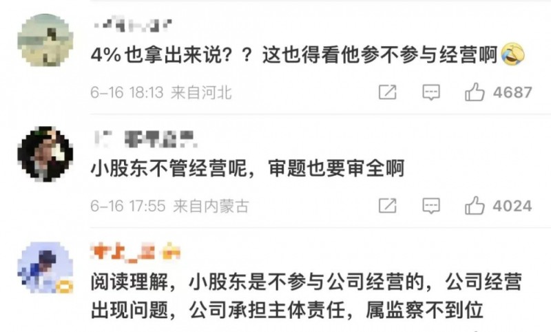 也有网友表示:“这得看他参不参与经营啊”“小股东是不参与公司经营的,公司经营出现问题,公司承担主体责任”……