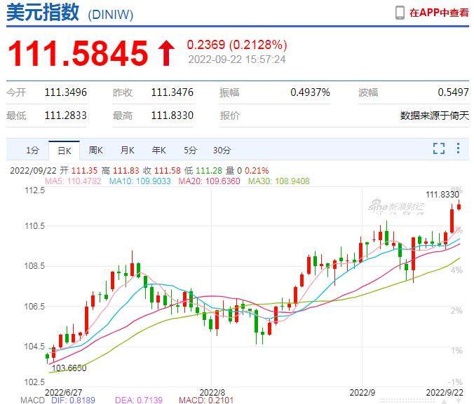 财联社9月22日消息,今日凌晨美国FOMC会议如期加息75个基点,美元指数涨超1%上至111.83,创2002年以来新高,导致离岸美元兑人民币汇率周四盘中突破7.1。