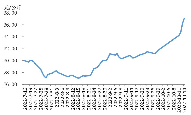 从生产端来看,9月下旬以来,我国生猪价格波动走高,中国养猪网养猪数据中心显示,10月19日,生猪(外三元)价格为每公斤28.17元,比9月15日(每公斤23.57元)上涨近20%。