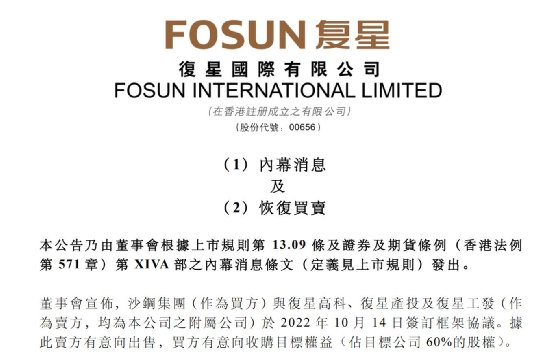 停牌三个交易日后,复星国际公告披露,沙钢集团与复星高科、复星产投及复星工发(作为卖方,均为复星国际附属公司)于2022年10月14日签订框架协议。卖方有意向沙钢集团出售目标公司60%股权。