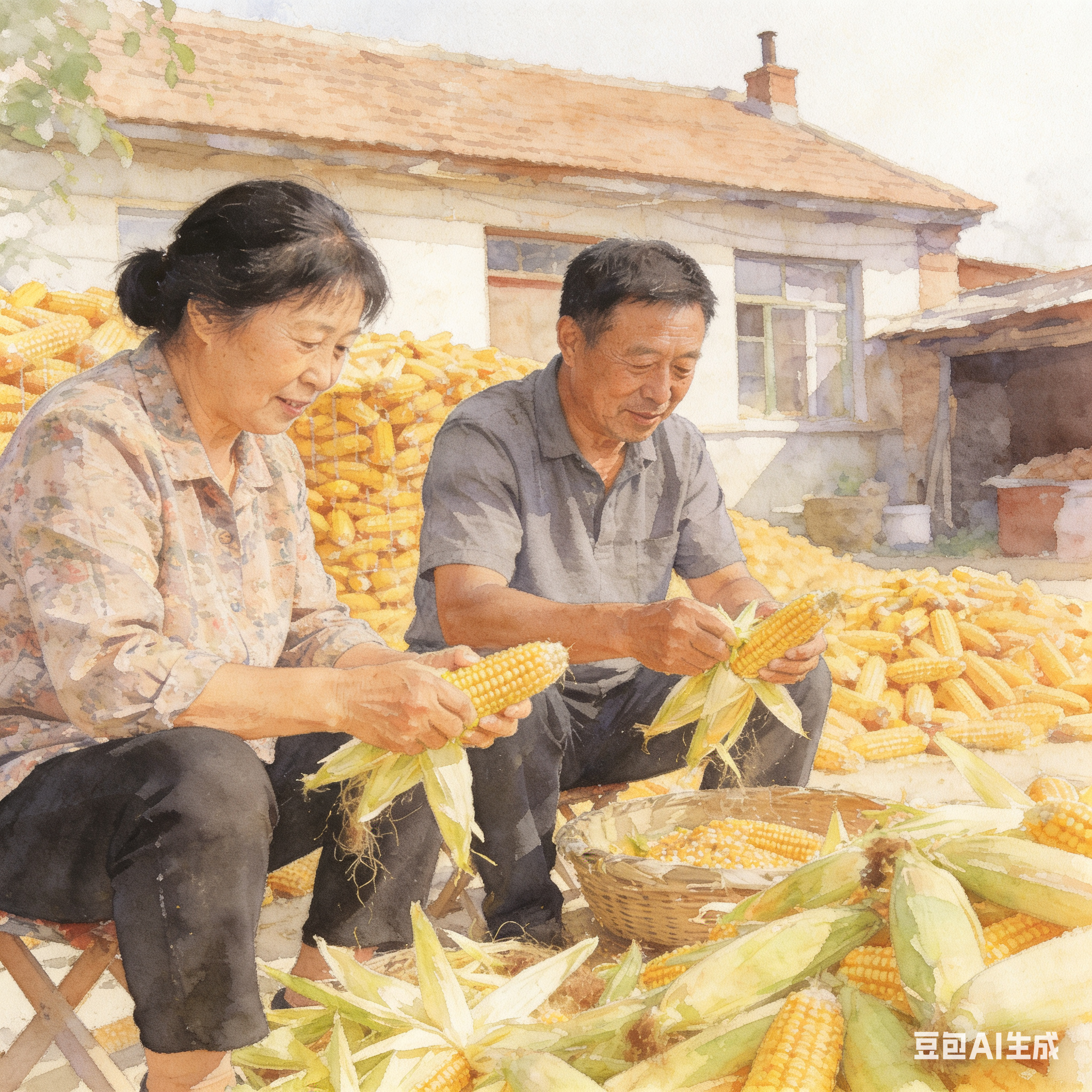 父亲开始剥玉米。