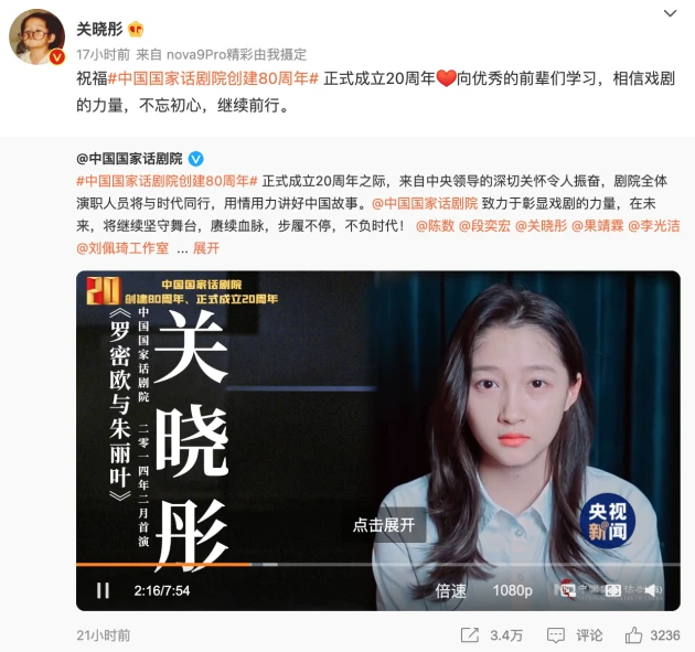 相比于易烊千玺、罗一舟、胡先煦三人引发的争议,去年12月,“关晓彤加入中国国家话剧院”冲上热搜,因为国家话剧院官方有明确表态,因此没有引发多少争议。