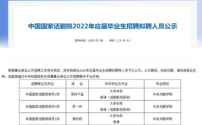 7月6日,根据人社部官网发布的《中国国家话剧院2022年应届毕业生招聘拟聘人员公示》显示,共有10位应届毕业生成为中国国家话剧院“2022年应届毕业生招聘拟聘用人员”,其中8人来自中央戏剧学院,1人来自中国传媒大学,1人来自北京电影学院。一共包含7名本科生,2名硕士研究生和1名博士研究生。刚刚从中央戏剧学院本科毕业的易烊千玺、罗一舟、胡先煦等“00后”青年演员,均进入了拟聘用名单。