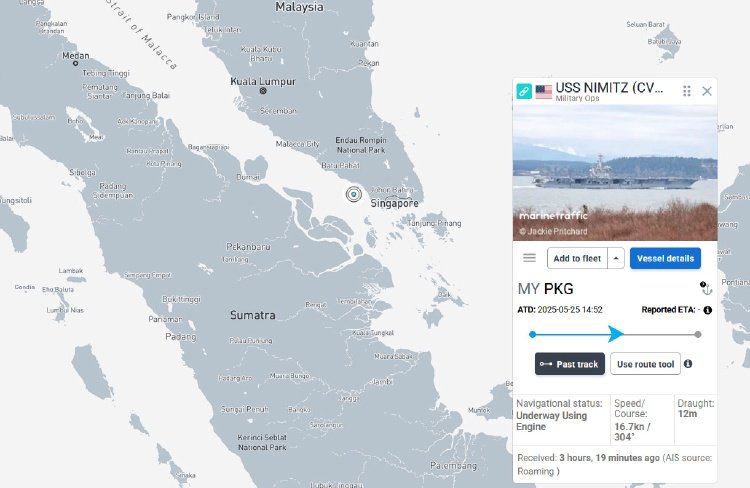 船舶追踪网站Marine Traffic的数据显示,当地时间16日早上,“尼米兹”号离开南海,向西朝中东方向航行。