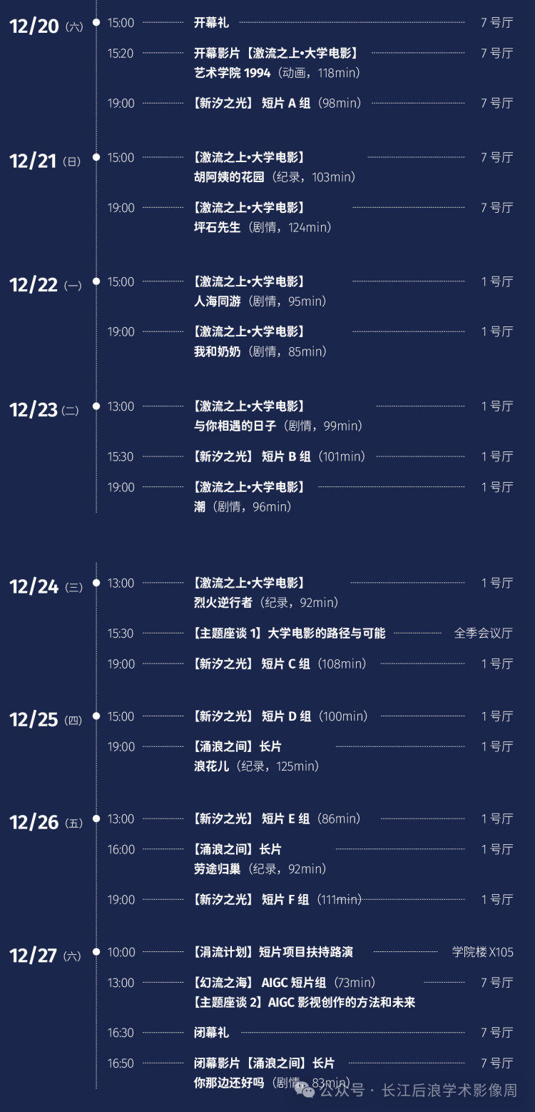 影片周所有展播均在龙湖U城CGV影城举行,免门票,市民可在“长江后浪学术影像周”官方公众号预约前往观看。所有放映场次提前10分钟开放入场,映后设有30分钟主创交流环节。