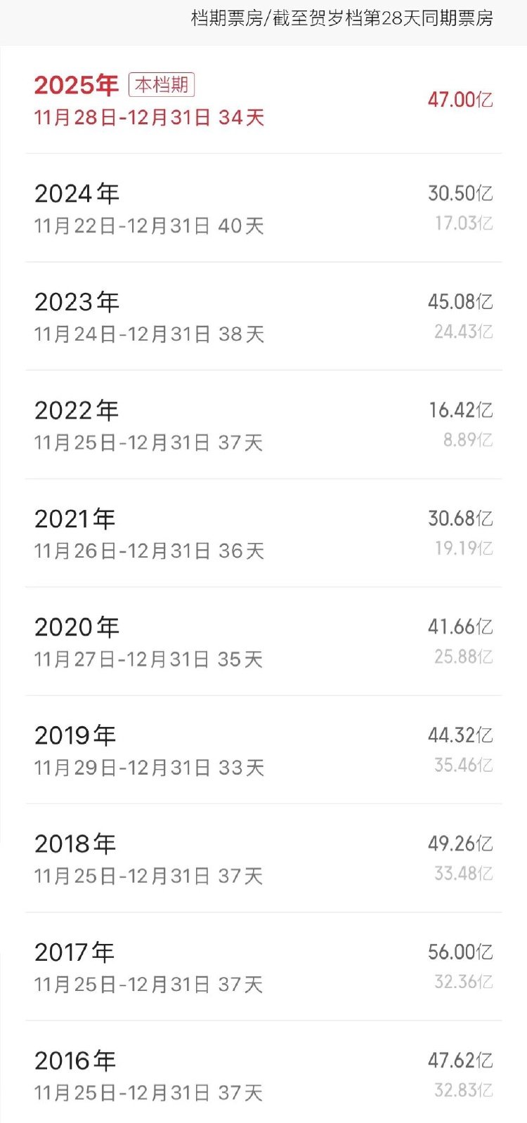 据猫眼专业版数据统计,今年贺岁档(总计34天)共有77部影片上映,截至25日上午10时,档期总票房(含预售)突破47亿元,这个成绩超过2024年的30.5亿元和2023年的45亿元,离2018年的49.2亿元也不远,而该档期的最好成绩则是2017年的56亿元。鉴于剩下的一周中还有12月31日跨年夜等小档期,今年贺岁档总票房有望突破50亿元,甚至冲击历史最高水平。