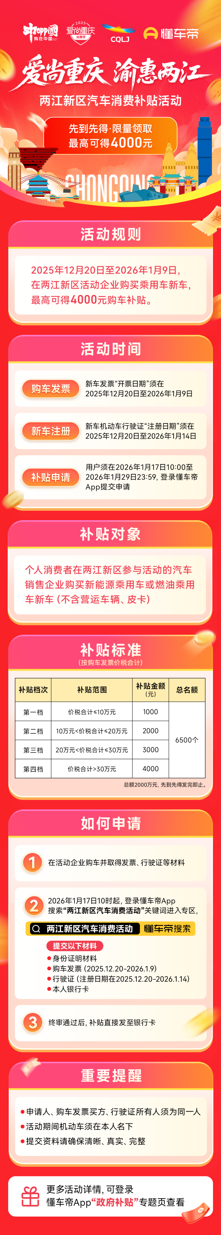 12月20日,两江新区“爱尚重庆 渝惠两江”汽车消费活动正式上线,将面向个人消费者发放总计2000万元购车补贴。2025年12月20日至2026年1月9日,在两江新区汽车零售企业购买乘用车(新车)并完成登记上牌;即可在2026年1月17日至2026年1月29日期间,通过“懂车帝”App政府补贴活动页面或搜索“两江新区汽车消费活动”,申请最高4000元购车优惠补贴。