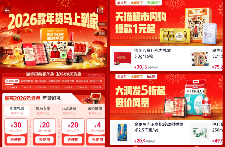 据悉,活动期间,用户搜索“年货节”进入会场,可领取最高2026元的券包,用户领券下单可享受多档满减优惠,覆盖百货、超市、酒水、生鲜等全品类商家。